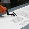 The installation ‘bios [bible]’ (2007) by Robotlab consists of an industrial robot which writes down the bible on rolls of paper. The machine draws the calligraphic lines with high precision – like a monk in the scriptorium.