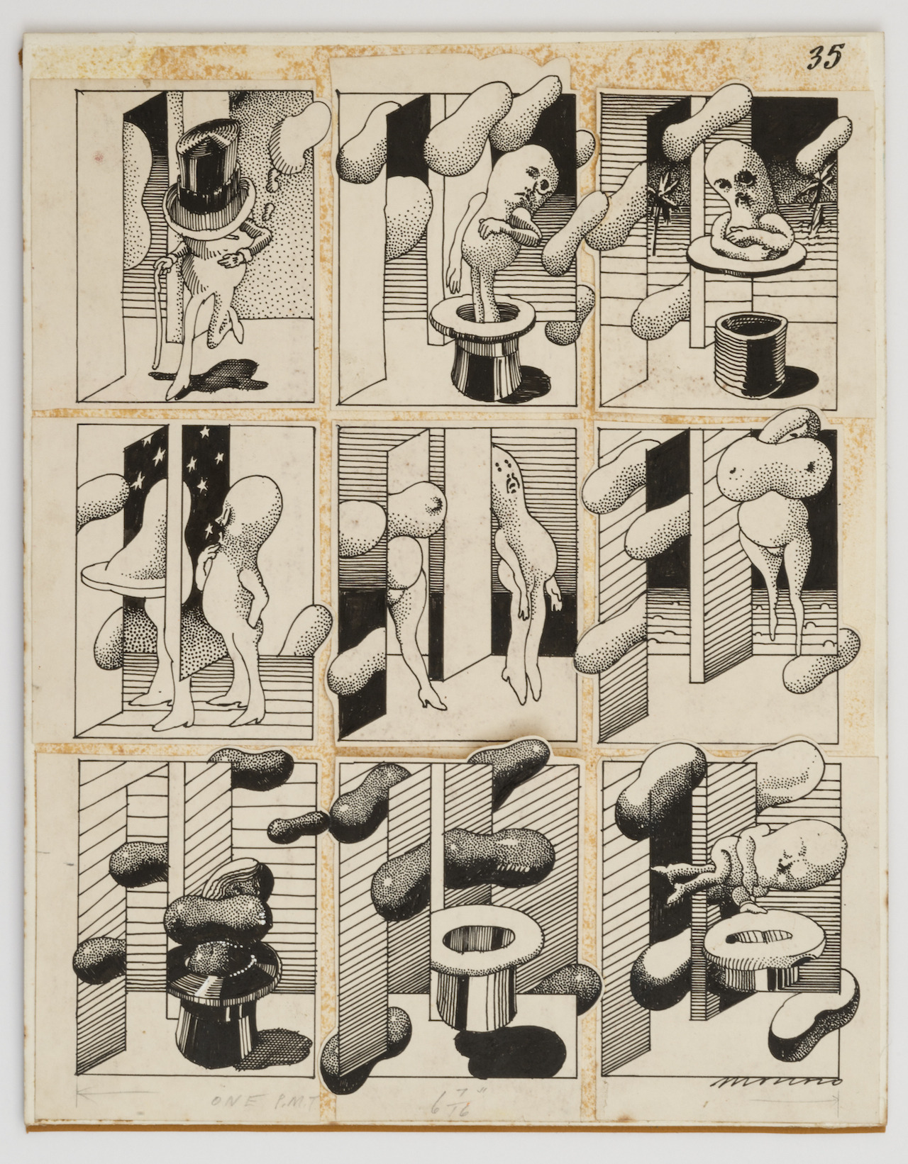 Victor Moscoso, “Mr. Peanut Metamorphosis” (Zap Comix no. 2) (1968), ink on paper, 12.75 x 10 inches (courtesy Andrew Edlin Gallery)