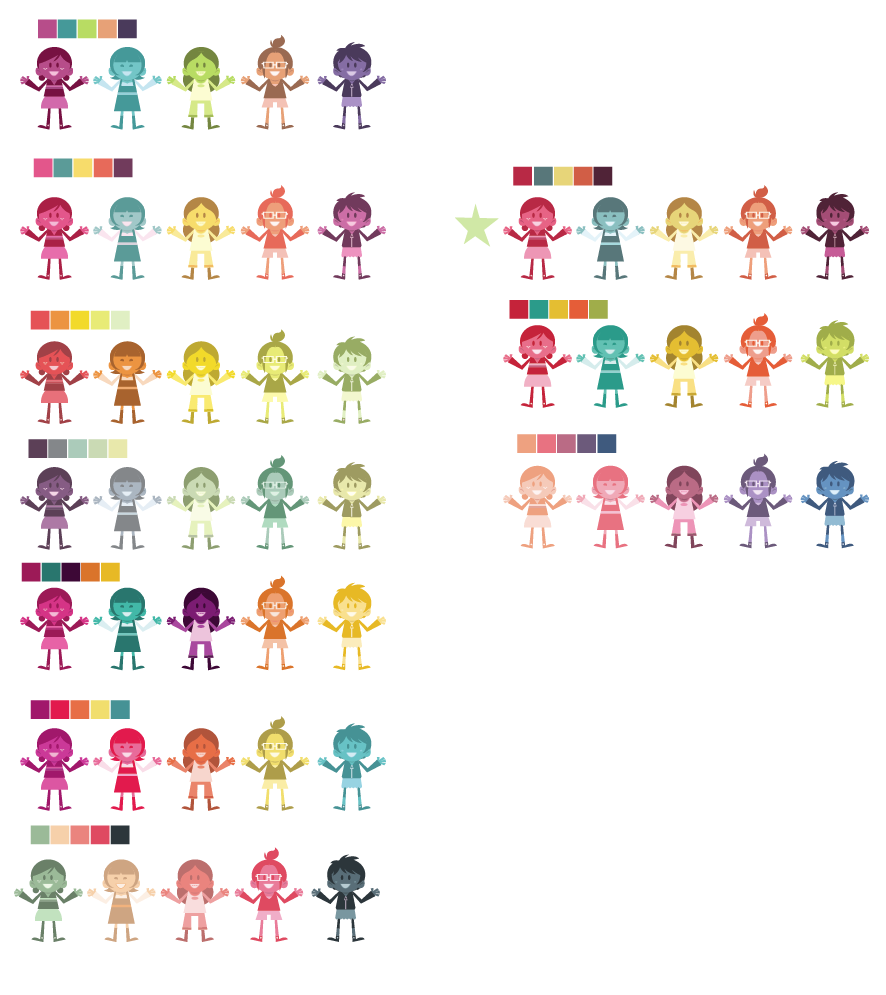 Final designs of the girls emerged. Color palates are my favorite. I always go overboard. When I presented these options everyone was like, “That is too many options.” COLORS OKAY.