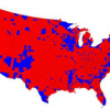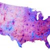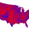 America really looks like this – I was looking at the amazing 2012 election maps created by Mark Newman (Department of Physics and Center for the Study of Complex Systems, University of Michigan), and although there is a very interesting blended voting map (Most of the country is some shade of purple, a varied blend of Democrat blue and Republican red) what I really wanted was this blended map with a population density overlay. Because what really stands out is how red the nation seems to be when you do not take the voting population into account; when you do so many of those vast red mid-west blocks fade into pale pink and lavender (very low population).