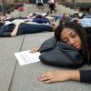The dramatic demonstration was part of a student-run “Die-In Protest” staged in response to the St. Louis County grand jury’s decision not to indict Darren Wilson, the white police officer who shot and killed black teenager Michael Brown in Ferguson, MO. This week colleges across the country have been holding emotional protests calling for an end to racism and police mishandling people of color.