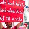 These tests, he explained, emerged around World War I as “intelligence” tests for the US Army. Public schools took them up at a time when dropout rates were high among working-class students and young people were “sorted” into tracks, pushing working-class students into vocational programs while the more elite students were tracked for more rigorous academic work. During the Cold War, students were tested more rigorously, but the ’60s and ’70s saw pushback from social movements on the way education was set up. But, Shor noted, for the last 40 years, there has been a strenuous public relations campaign pushing for more testing — more “accountability” to keep American students “competitive.”