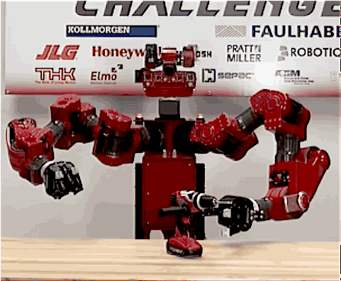 CMU’s CHIMP demonstrates its ability to manipulate a drill for the DARPA Robotics Challenge.