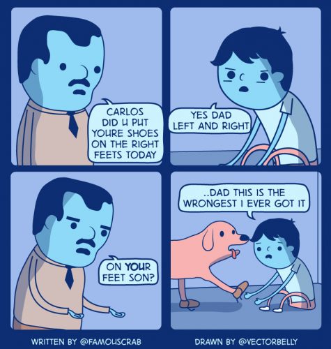 “carlos did u put youre shoes on the right feets today” YES DAD LEFT AND RIGHT “on YOUr feet son?” ..DAD THIS IS THE WRONGEST I EVER GOT IT