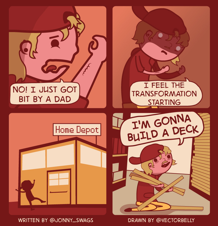 No! I just got bit by a Dad. I feel the transformation starting *goes to Home Depot & buys materials to build a deck* I’M GONNA BUILD A DECK