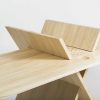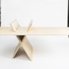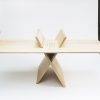 Just three pinewood pieces make up this table. The design has been performed without leg corners and it makes easier dismantling since it has no screws or additional substructures. Furthermore, it takes up the least space in volume.